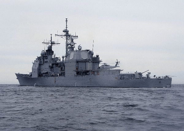 Aegis Cruiser (CG 72, Vella Gulf). Two of the Aegis antenna array faces are visible on the rear deckhouse. The other two antenna faces are on the forward deckhouse but are not visible here. (Picture source: U.S. Navy)