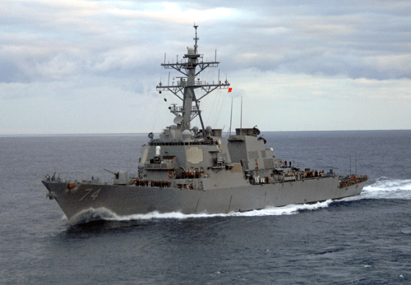 Aegis Destroyer (DDG-74, U.S.S. McFaul). The two forward Aegis antenna faces are visible on the forward deckhouse. The other two faces are on the same deckhouse but are not visible here. (Photograph source: U.S. Navy)