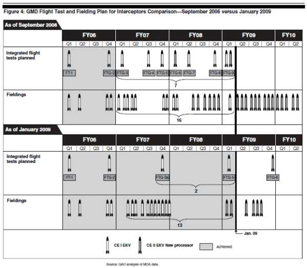 Figure 2. From a 2009 GAO report.[1] The last row the of the chart shows the deployment of of GBIs from the beginning of FY 2006 through the first quarter of FY 2009 (shaded in light blue).