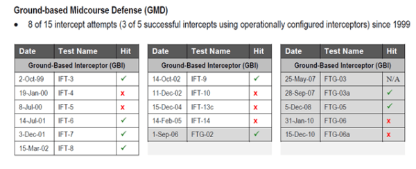Thus it is now clear, seven years after the test, that the despite repeated claims by the MDA that the test was a “successful intercept,” that it did not actually destroy its target. Moreover, the MDA still claims that the test resulted in a “successful intercept”. Here is a table from a fact sheet on the MDA’s website that I downloaded today (the date on the fact sheet is July 10, 2012), showing FTG-02 as a “successful intercept.” (The tests of operationally configured interceptors are the last six, whose names begin with “FTG”).