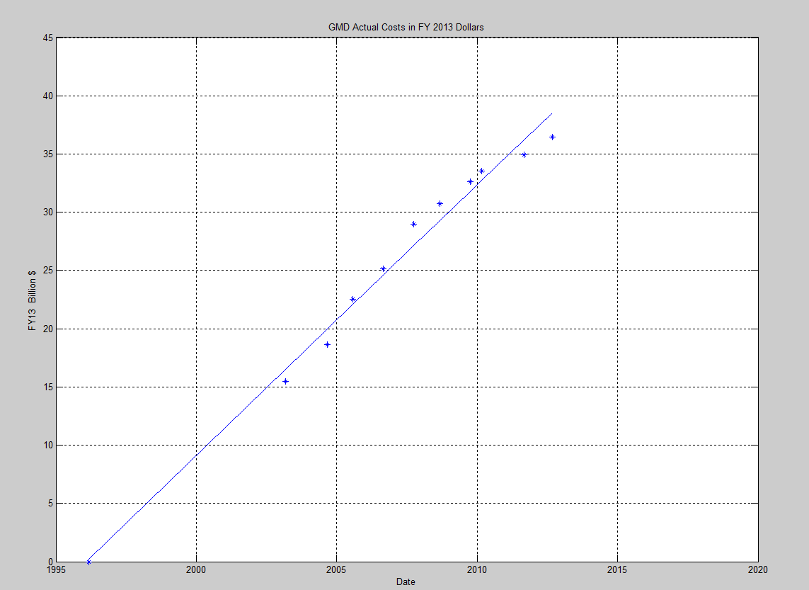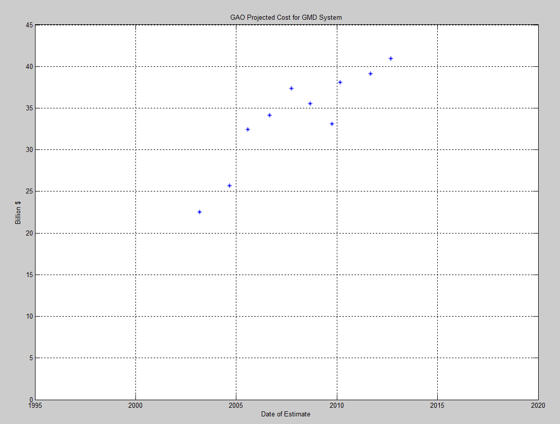 At the Pentagon’s March 15 press conference, it was announced that an intercept test using an older CE-I kill vehicle would be conducted this summer. The budget documents state add that this test will be conducted in “in third quarter 2013 to validate reliability improvements made to the CE-I fleet over the last several years. [3] As discussed in a previous post on GBI cost, the GAO estimated that each of the original CE-I GBIs needed repairs and refurbishments that were estimated to cost between $14 and $24 million per interceptor.