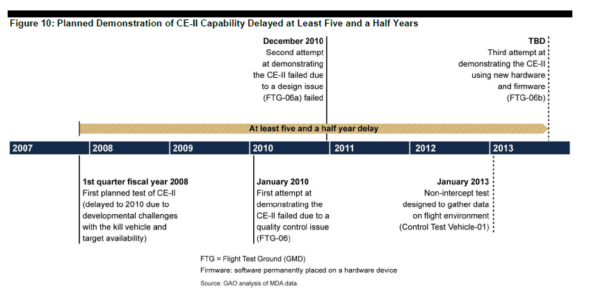 Figure 2. Figure from 2013 GAO Report showing at least five years of delay in the GMD testing program due to problems with the new CE-II GBIs.[7] Click on the figure for a larger image.