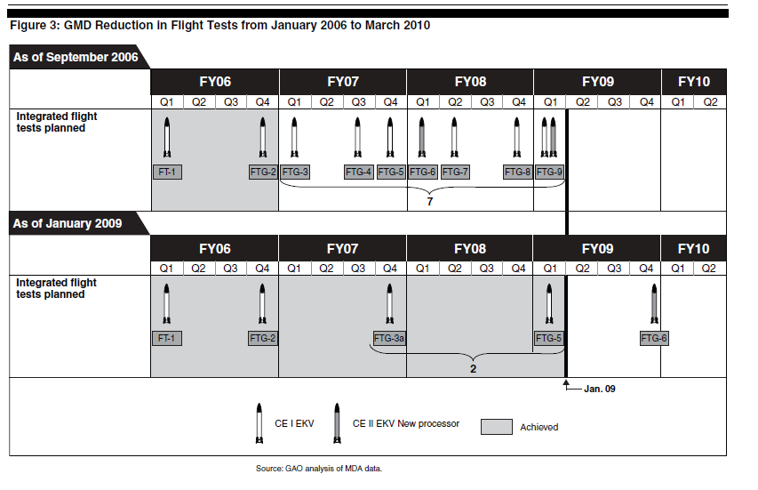 Figure 3. GAO chart illustrating the reductions that occurred in 2007-2008 in the number of planned GMD tests through FY2010.[8] Click on the figure for a larger image.