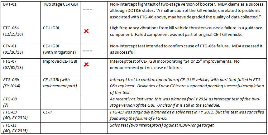 Thus well over $1 billion will ultimately be spent demonstrating the basic operation of the CE-II GBI even if the next test, FTG-06b, is completely successful. To put this in perspective, the most recent test GMD test, FTG-07, held earlier this month, reportedly cost about $214 million (although the costs of investigating its failure will increase this.) In 2012, MDA told Congress that the planned future tests FTG-11 and FTG-13 would cost $206 and $191 million respectively. At roughly $200 million each, MDA could have conducted roughly five intercept tests for the over $1 billion it will expend trying to get a CE-II interceptor to hit a target.