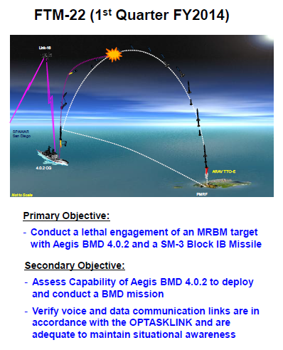 The MDA has announced that yesterday it conducted a successful intercept test of an SM-3 Block IB interceptor against a seperating medium-range target. This test, designated FTM-22 , would be the fifth successful intercept test of the SM-3 Block IB after the first intercept test failed. The MDA has previously stated that successfully completing FTM-22 would allow full rate production of the Block IB interceptor to begin.